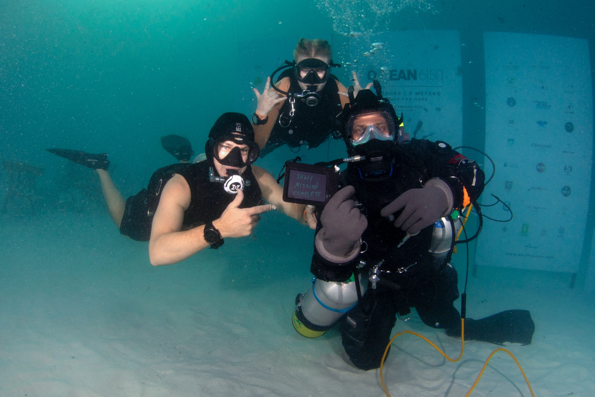 Shafraz Naeem wraz z zespołem wsparcia podczas swego 50-cio godzinnego nurkowania.