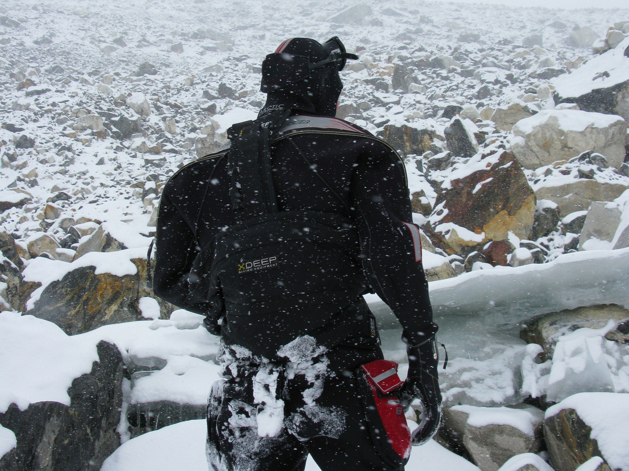 Pośród zapierającej dech w piersiach panoramy wysokich szczytów i lodowych widoków, nurkowie musieli zmierzyć się z przenikliwym wiatrem, który w połączeniu z temperaturami spadającymi do -20 st.C. i padającym okresowo śniegiem, tworzył ekstremalnie trudne warunki do pieszej wędrówki, nie wspominając już o nurkowaniu.