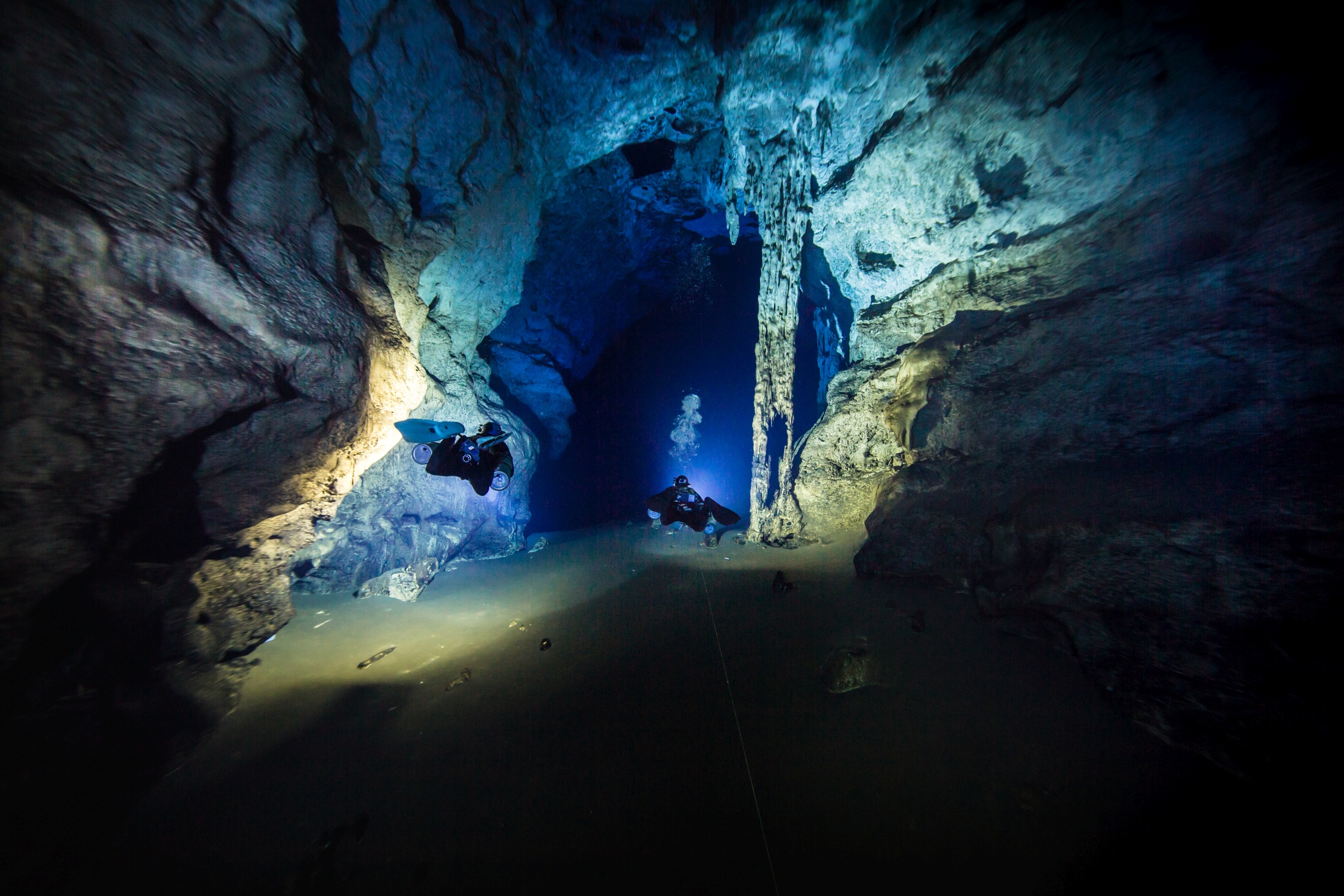 Wejście do jaskini wymagało typowej dla miejscowych biegłości we wspinaczce po drzewach i głazach, dlatego zespół mądrze wybrał opcję zjazdu na linie. Gdy udało się wreszcie dotrzeć do wejścia do wody, członkowie zespołu poczuli spore rozczarowanie. Na końcu ogromnego zapadliska znajdowała się metrowej średnicy błotnista kałuża, która nijak miała się do błękitnej wody z wcześniej słyszanych opowieści. W rzeczywistości jednak miejsce to ledwie dwa dni później okazało się być króliczą norą w stylu Alicji w Krainie Czarów.