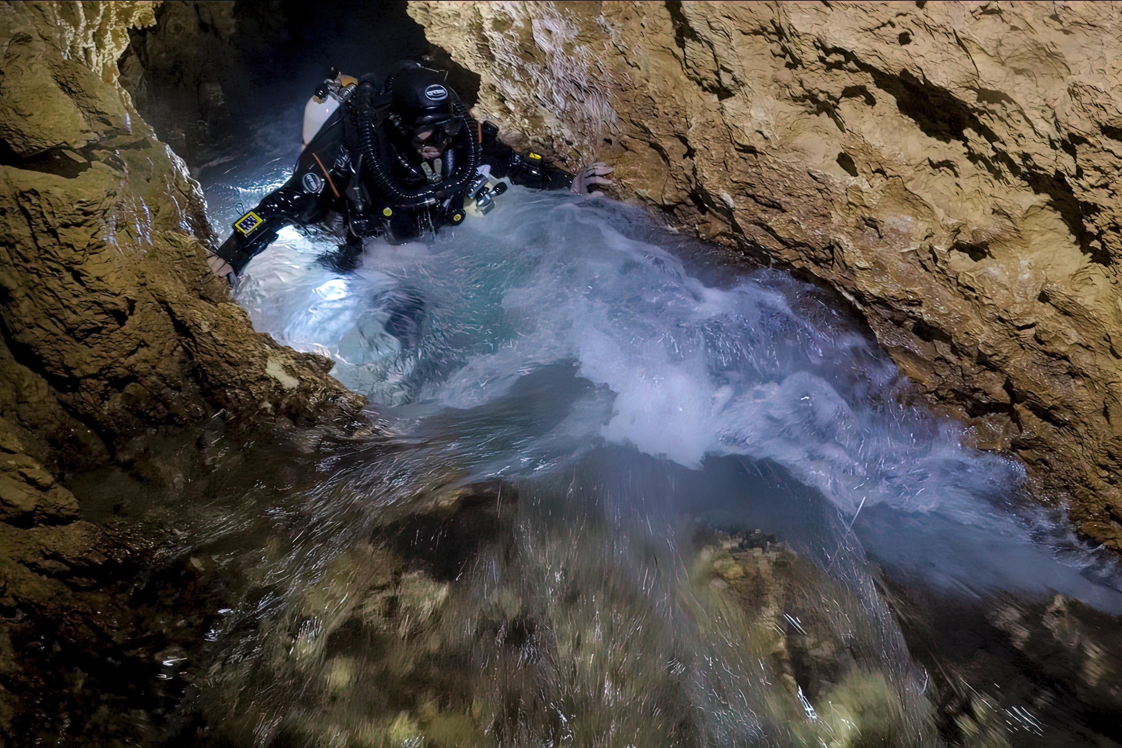 Dostęp do głębokiej części jaskini okazał się być nieco skomplikowany. Wywierzysko za mniejszym otworem osiąga głębokość 22 metry i kończy się suchą sekcją, na końcu której znajduje się wodospad. Przebycie kilkumetrowego progu w pełnym sprzęcie nurkowym jest nie lada wyzwaniem, bo cała woda z tej przepływowej jaskini leje się z pełną siłą wodospadu bezpośrednio na głowę. Dalej czekał kilkusetmetrowy syfon, który nagle otworzył się w szczelinę, a następnie epicki kanion opadający na ponad 100 metrów.