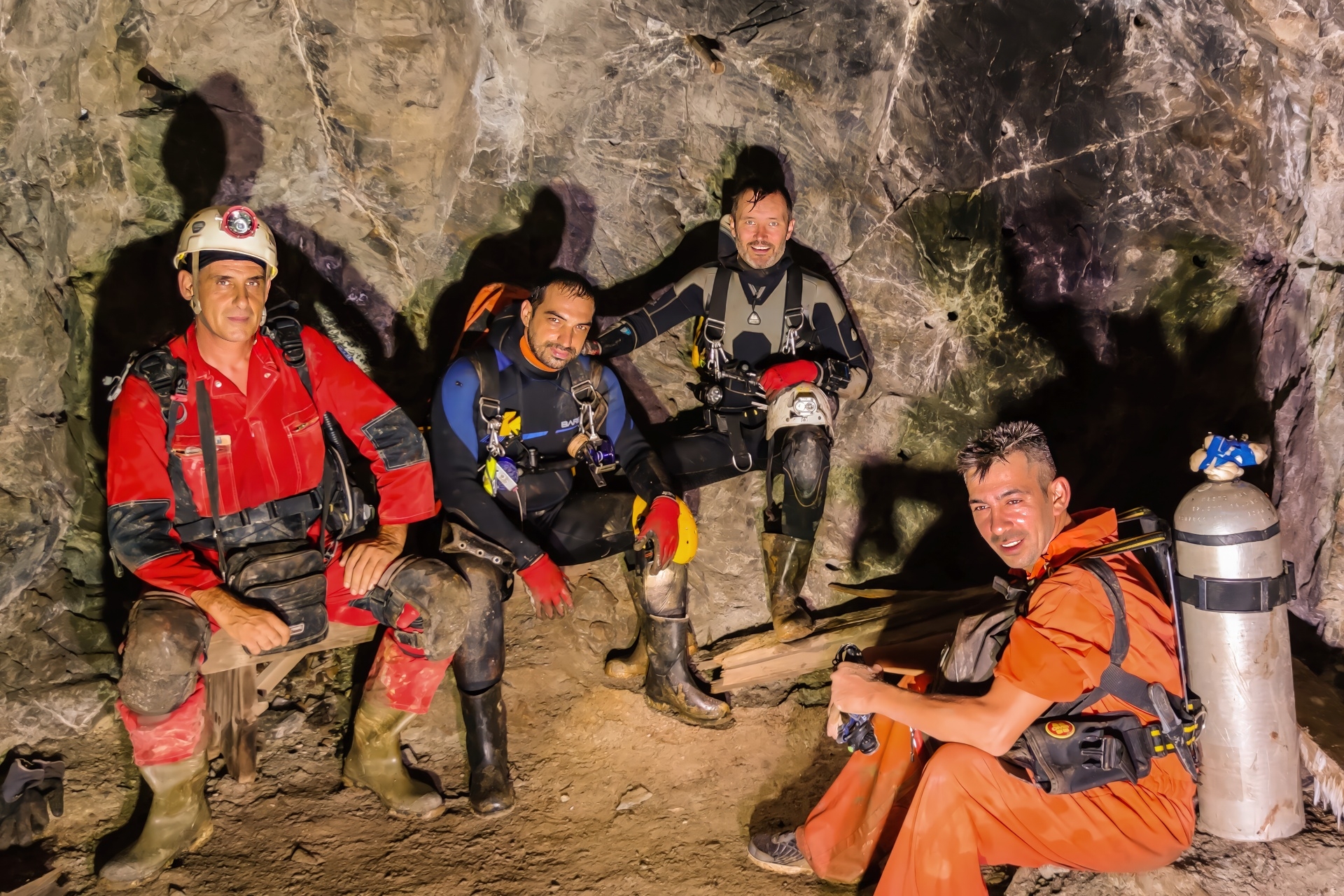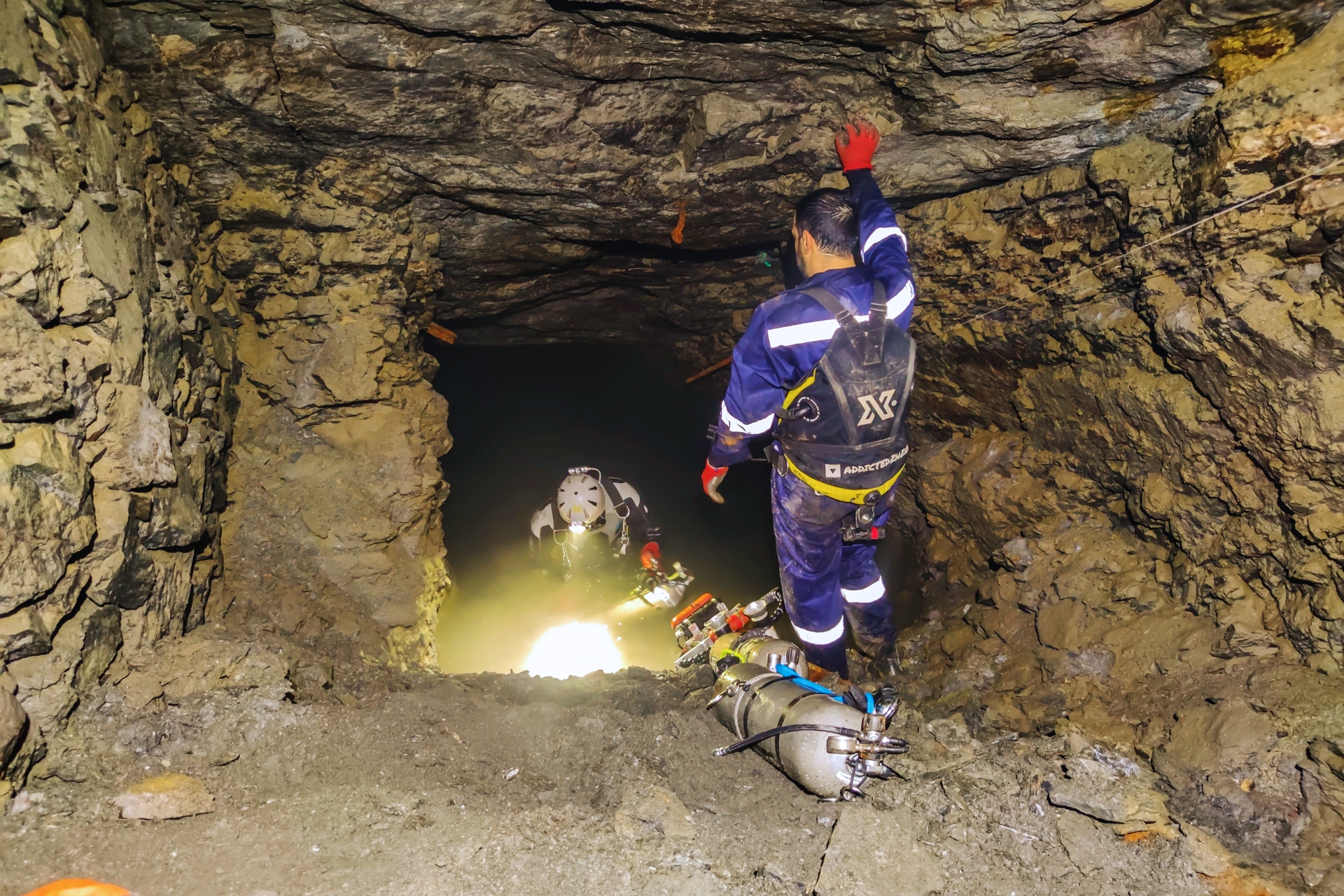 Zespół przygotowujący się do nurkowania w zalanej kopalni Sklives, Grecja.